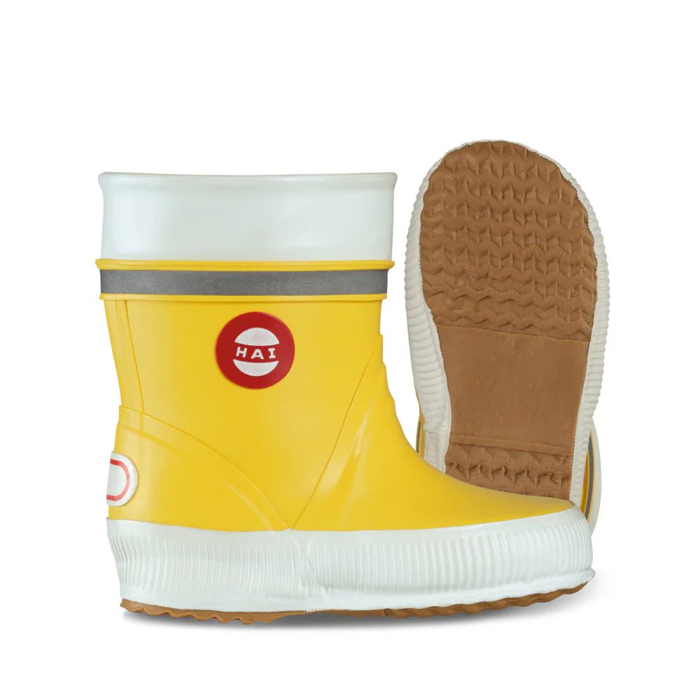 Hai Kids lasten kumisaappaat ovat klassikkosaappaan pienempi versio. Nämä matalavartiset luonnonkumisaappaat ovat helppo pukea jalkaan, ja niiden käytännöllinen muotoilu takaa sen, että ne sopivat täydellisesti pienille jaloille. Saappaiden napakka kanta ja riittävän väljä teräosa tarjoavat kasvavalle jalalle tilaa ja mukavuutta. Keltainen väri tuo pirteyttä ja iloa sadepäivän leikkeihin sekä pukeutumiseen.