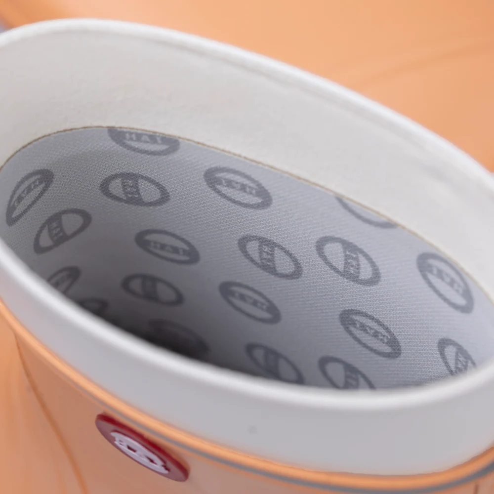 Naisten persikanvärinen kumisaapas peach fuzz on valittu vuoden 2024 väriksi ja se sopii monenlaisiin asukokonaisuuksia ja tilanteisiin. Hai-luonnonkumisaapas onkin erinomainen vaihtoehto niin kaupungille, metsäretkille kuin mökkipoluille.